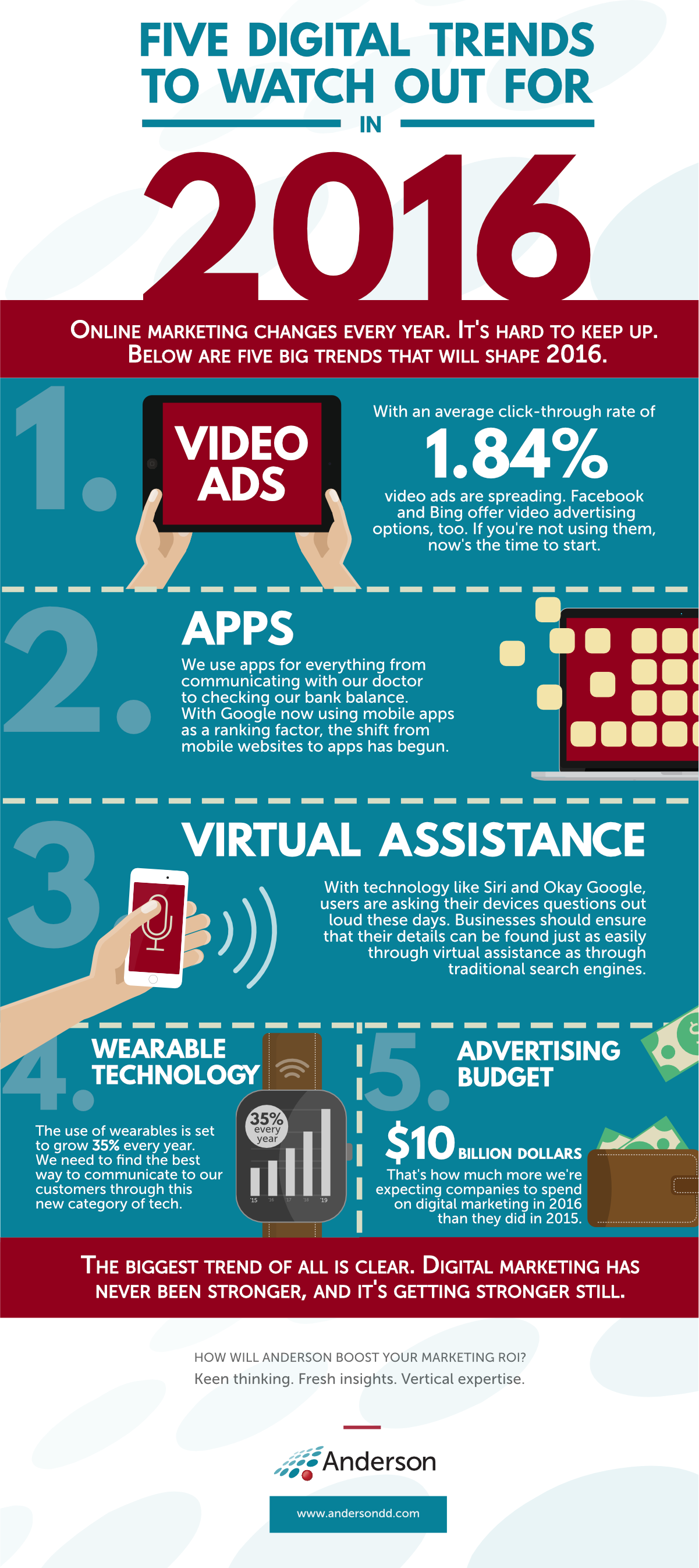 In reference to our last post, What's Hot in Digital: 5 Digital Trends for 2016, here is a snapshot of the top digital marketing trends for 2016: